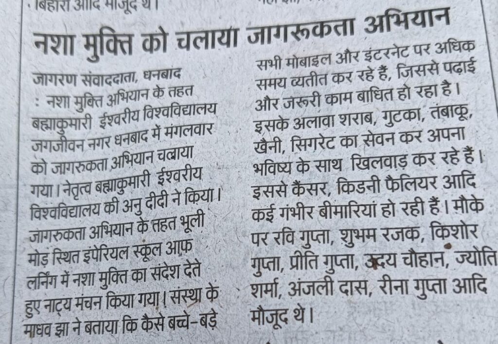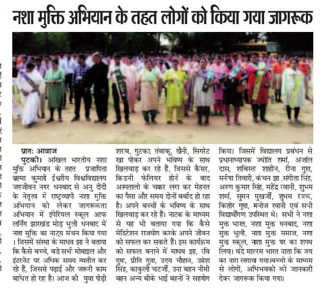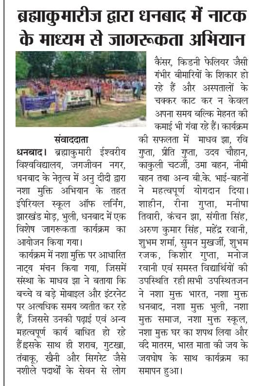 आज दिनांक 06/05/2025 दिन मंगलवार को सुबह 8 बजे से नशा मुक्ति अभियान के तहत बह्माकुमारी ईश्वरीयविश्वविद्यालय जगजीवन नगर धनबाद से अनु दीदी ने नेतृत्व में राष्ट्रव्यापी नशा मुक्ति अभियान को लेकर जागरूकता अभियान में इंपेरियल स्कूल आफ लर्निंग झारखंड मोड़ भुली धनबाद में नशा मुक्ति नाट्य मंचन किया गया