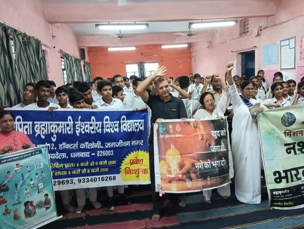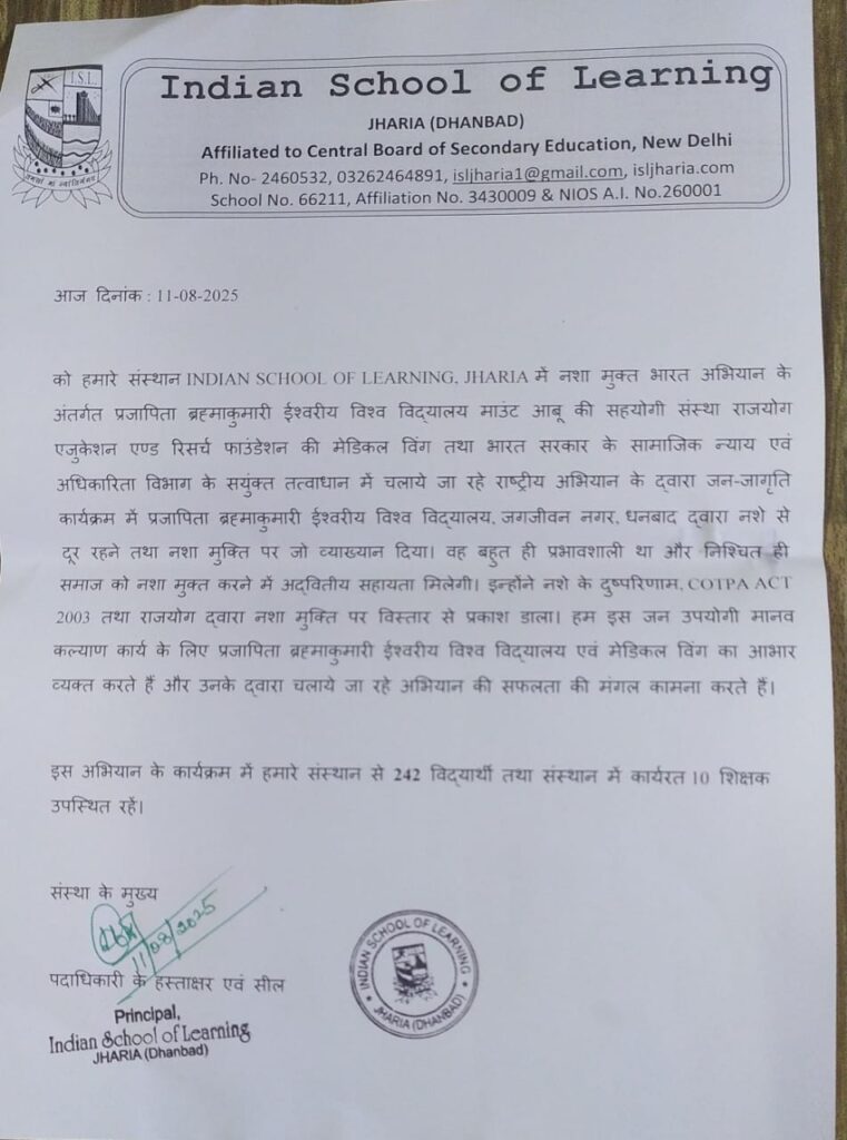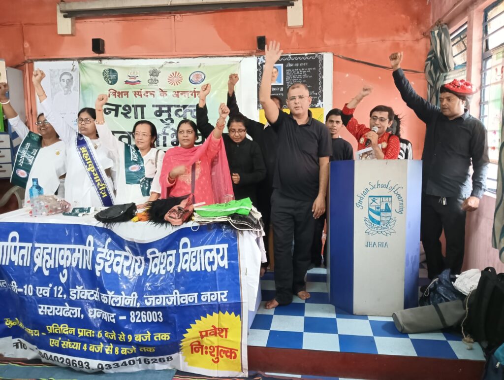 आज दिनांक 11/08/2025को तय कार्यक्रम के तहत प्रजापिता ब्रह्माकुमारी ईश्वरीय विश्वविद्यालय जगजीवन नगर धनबाद के द्वारा अनुदीदी के नेतृत्व में राष्ट्रव्यापी नशा मुक्ति अभियान को लेकर आई एस एल स्कूल झरिया कतरास मोड़ मे जागरूकता अभियान नाट्य मंचन किया गया जिसमें संस्था से रवि गुप्ता माधव झा उदय चौहान काकुली बहन प्रिती बहन निम्मी बहन तंद्रा मोइत्रा पुनम कुमारी आलोक साव रिया कुमारी ने बहुत उम्दा नाट्य मंचन किया मौके पर प्रधानाध्यापक हेमंत ठाकुर उपप्रधानाचार्य रीता शर्मा अनिमेष चटर्जी गौरव चटर्जी तापस चटर्जी बिरेंद्र रवानी पिनाक भुषण ठाकुर अन्य शिक्षक शिक्षिकाओं सहित विधार्थीगण उपस्थित थे सभी ने मिलकर नशा मुक्त भारत नशा मुक्त धनबाद नशा मुक्त झरिया नशा मुक्त स्कूल कालेज नशा मुक्त घर नशा मुक्त मन भारत माता कि जय वंदे मातरम का नारा लगाया और शपथ लिया कि भविष्य में किसी भी तरह नशा नहीं करेंगे और घर परिवार समाज में भी लोगों को प्रेरित करेंगे