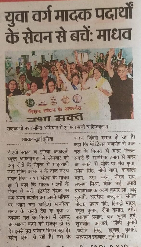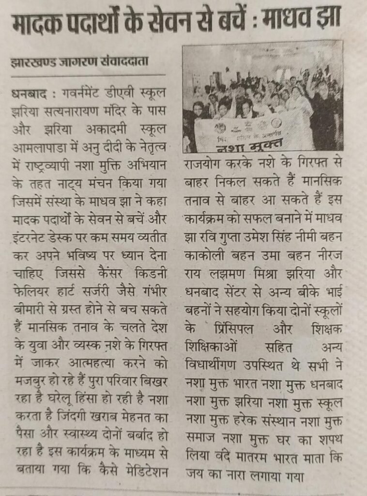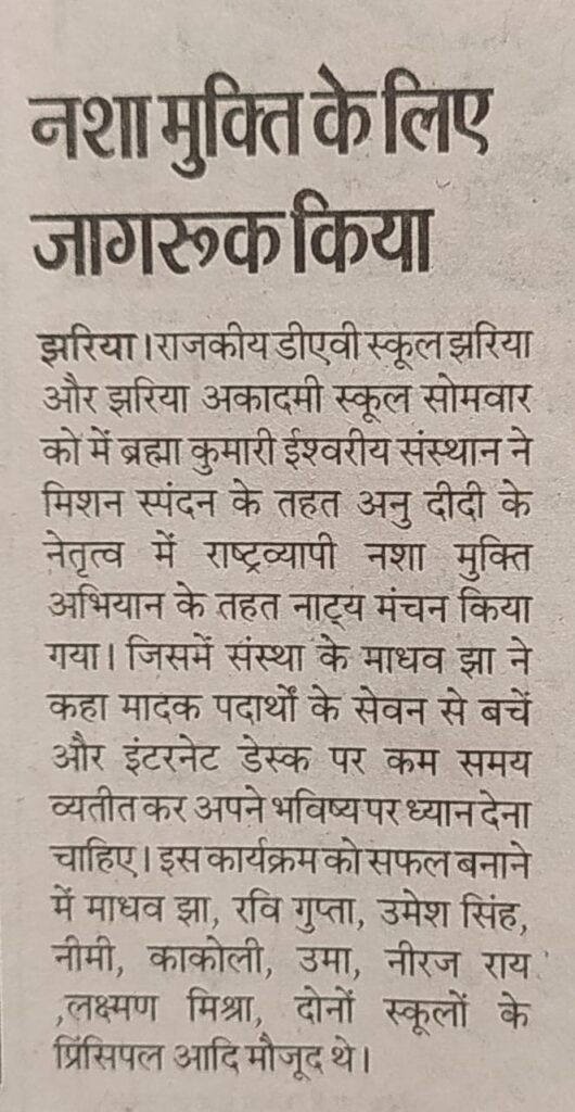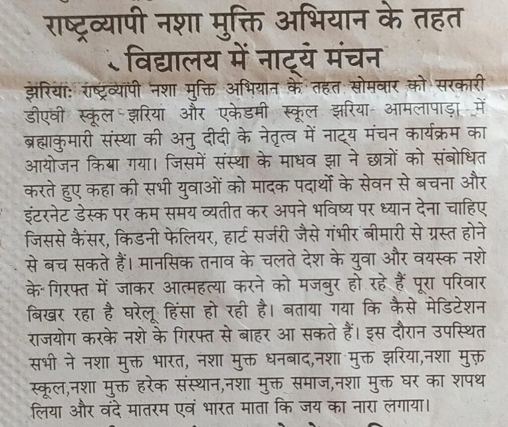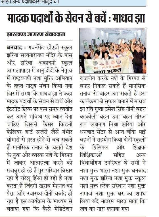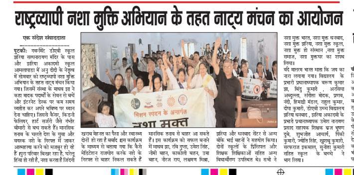 दिनांक 19-05-2025 सोमवार को डीएवी स्कूल, स्टेशन रोड, झरिया और झरिया अकादमी स्कूल, आमलापाडा में अनु दीदी के नेतृत्व में राष्ट्रव्यापी नशा मुक्ति अभियान के तहत नाट्य मंचन का आयोजन किया गया. जिसमें संस्था के वक्ताओं ने कहा मादक पदार्थों के सेवन से बचें और इंटरनेट डेस्क पर कम समय व्यतीत कर अपने भविष्य पर ध्यान देना चाहिए. जिससे कैंसर किडनी फेलियर हार्ट सर्जरी जैसे गंभीर बीमारी से ग्रस्त होने से बच सकते हैं।