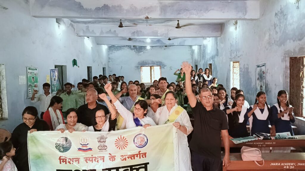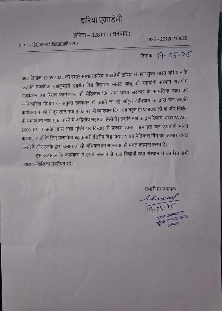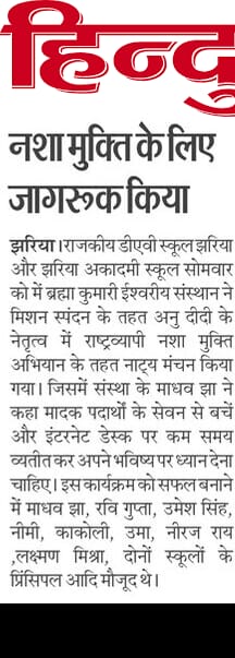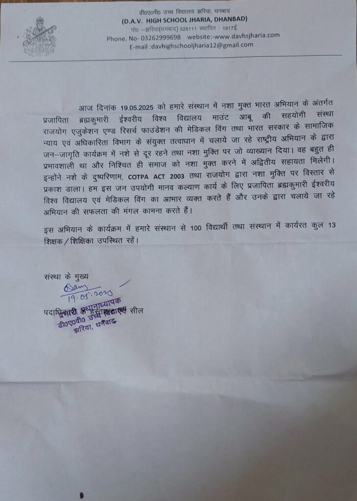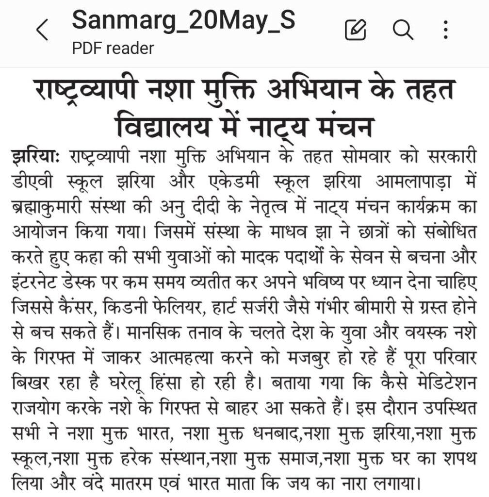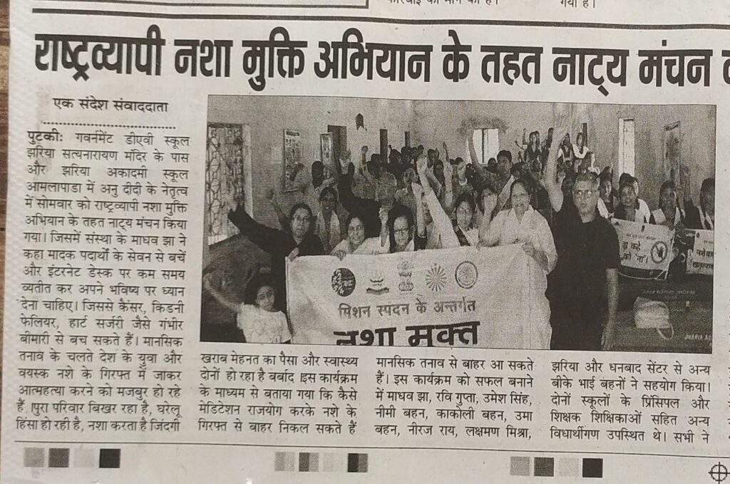 दिनांक 19-05-2025 सोमवार को डीएवी स्कूल, स्टेशन रोड, झरिया और झरिया अकादमी स्कूल, आमलापाडा में अनु दीदी के नेतृत्व में राष्ट्रव्यापी नशा मुक्ति अभियान के तहत नाट्य मंचन का आयोजन किया गया. जिसमें संस्था के वक्ताओं ने कहा मादक पदार्थों के सेवन से बचें और इंटरनेट डेस्क पर कम समय व्यतीत कर अपने भविष्य पर ध्यान देना चाहिए. जिससे कैंसर किडनी फेलियर हार्ट सर्जरी जैसे गंभीर बीमारी से ग्रस्त होने से बच सकते हैं।