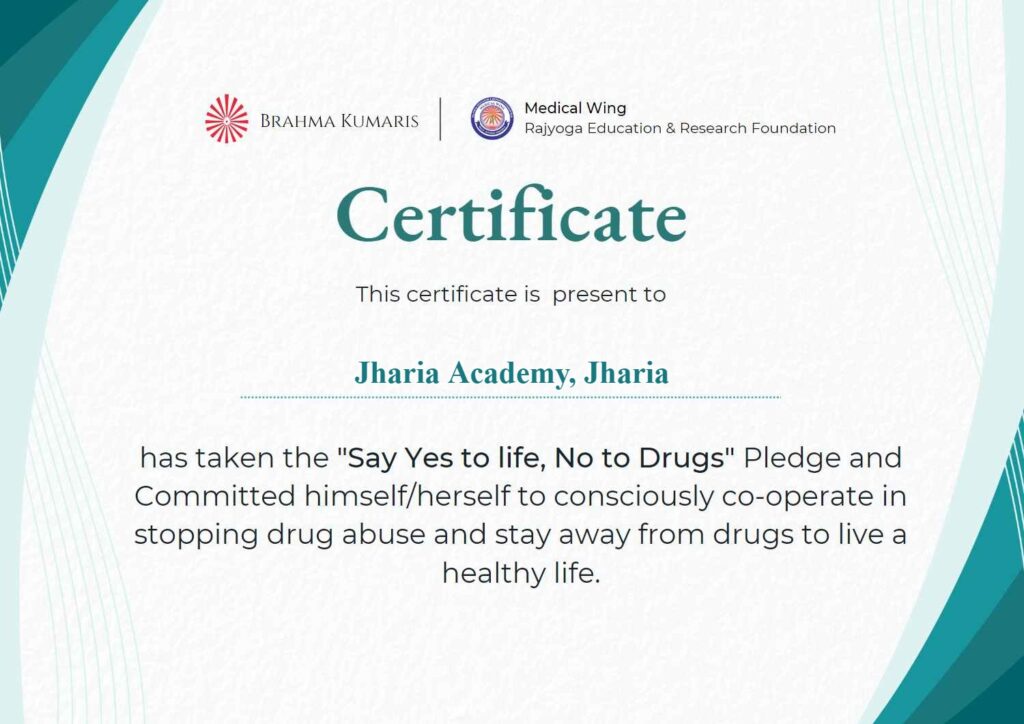 इस कार्यक्रम को सफल बनाने में माधव झा, रवि गुप्ता, उमेश सिंह, नीमी बहन, काकोली बहन, उमा बहन, नीरज राय, लक्ष्मण मिश्रा झरिया और धनबाद सेंटर से अन्य बीके भाई बहनों ने सहयोग किया दोनों स्कूलों के प्रिंसिपल और शिक्षक शिक्षिकाओं सहित अन्य विधार्थीगण उपस्थित थे। सभी ने नशा मुक्त भारत नशा मुक्त धनबाद नशा मुक्त झरिया नशा मुक्त स्कूल नशा मुक्त हरेक संस्थान नशा मुक्त समाज नशा मुक्त घर का शपथ लिया गया