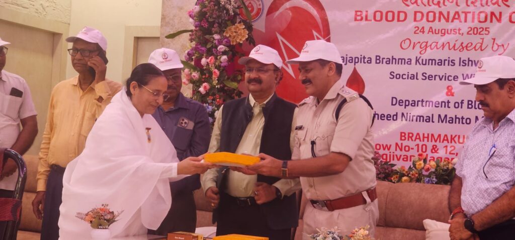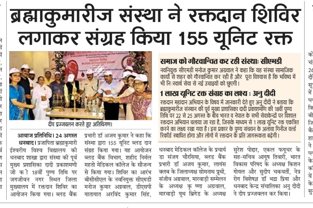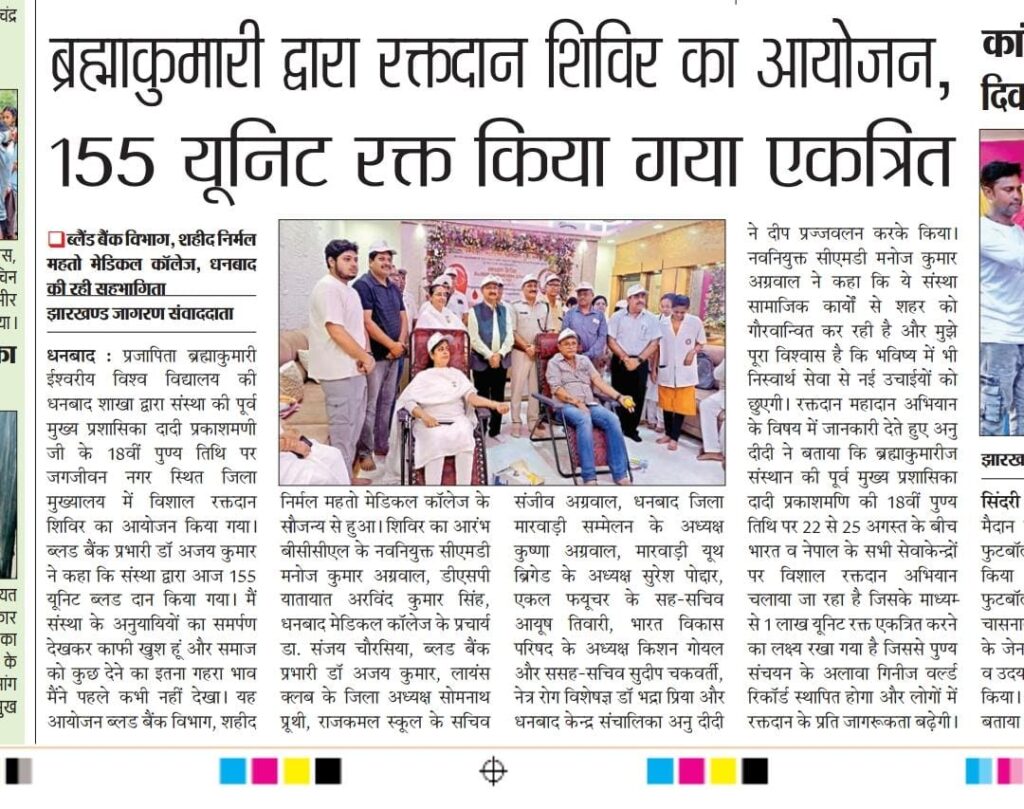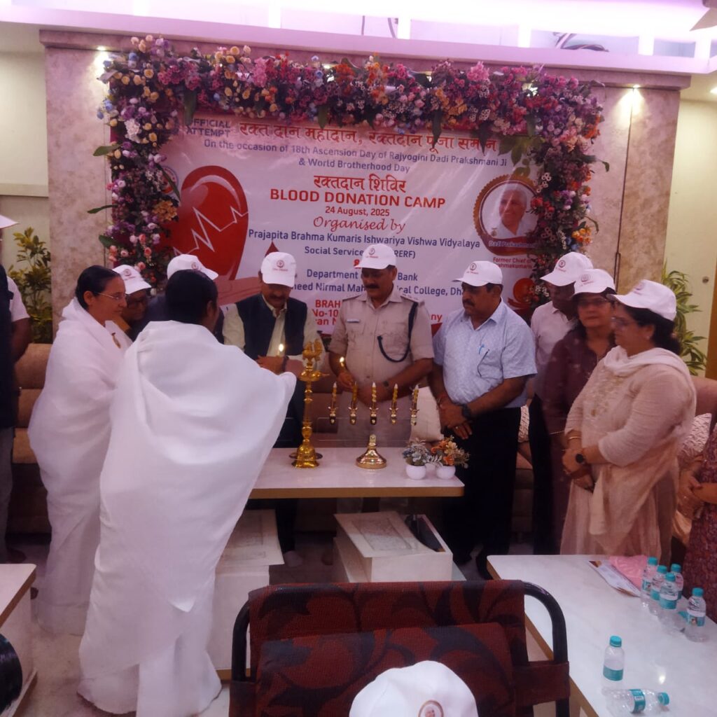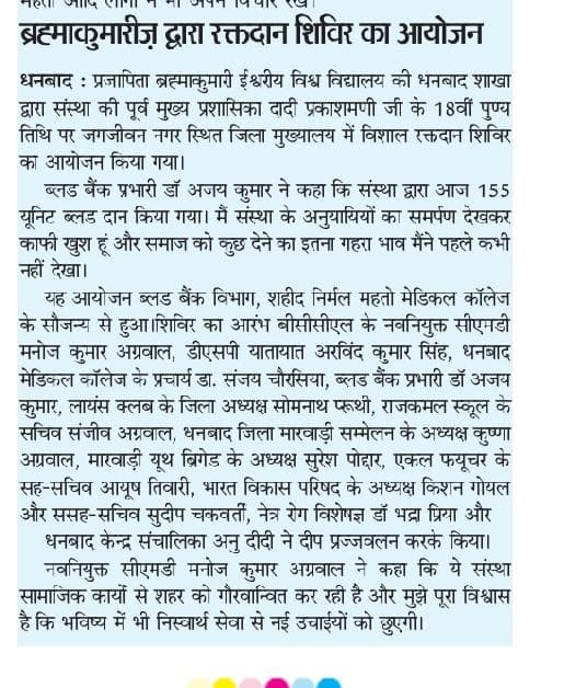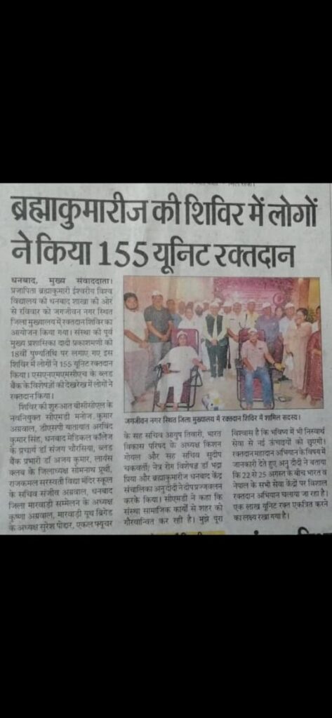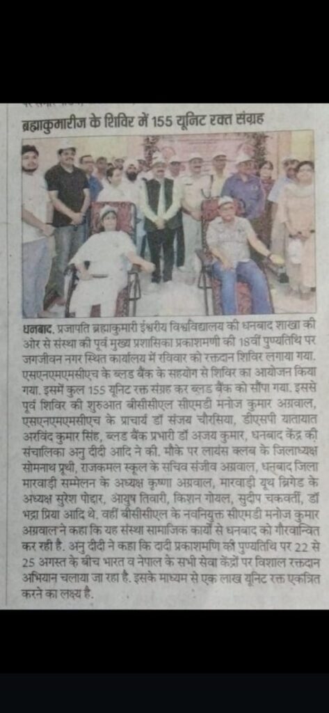 प्रजापिता ब्रह्माकुमारी ईश्वरीय विश्व विद्यालय की धनबाद शाखा द्वारा संस्था की पूर्व मुख्य प्रशासिका दादी प्रकाशमणी जी के 18वीं पुण्य तिथि पर जगजीवन नगर स्थित जिला मुख्यालय में विशाल रक्तदान शिविर का आयोजन किया गया।