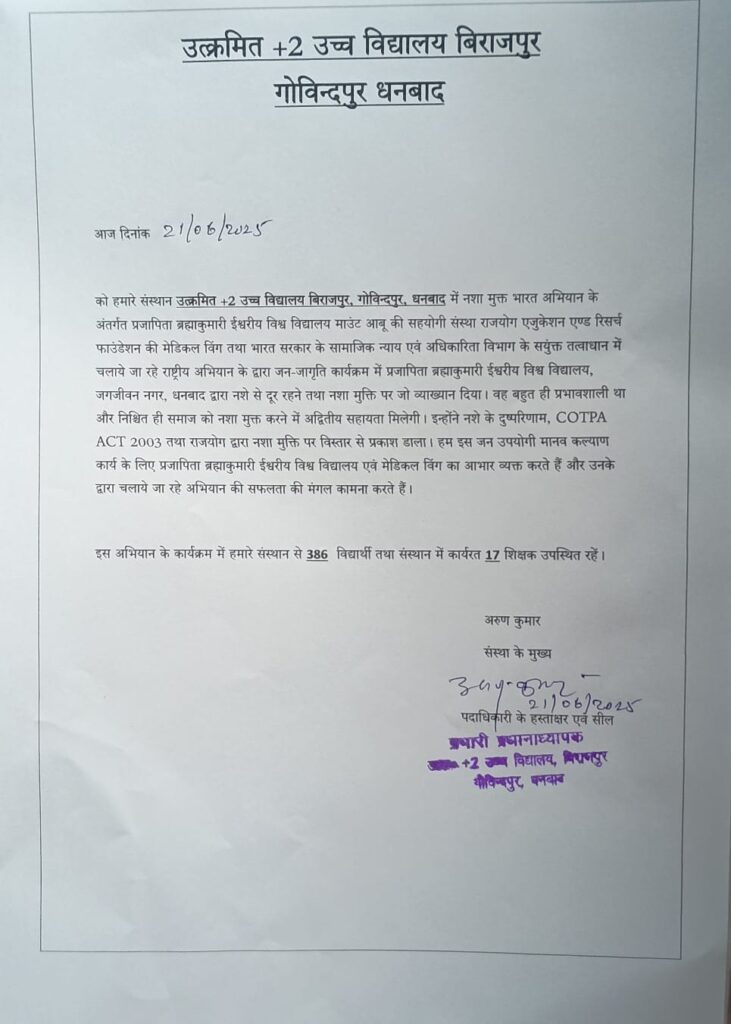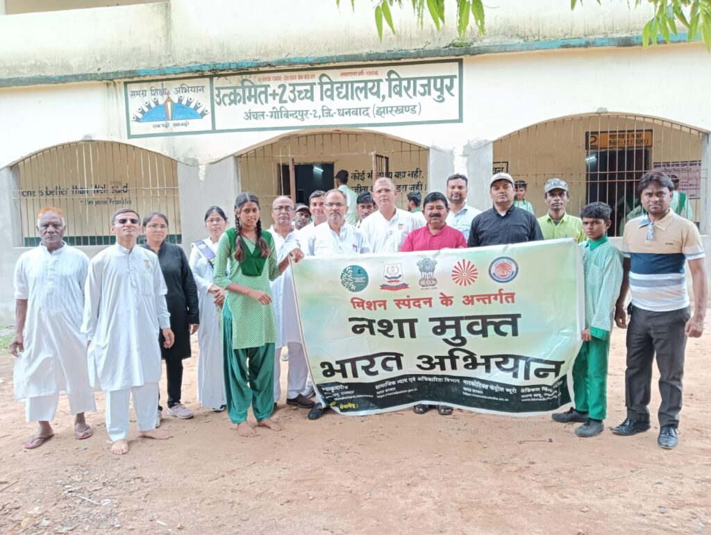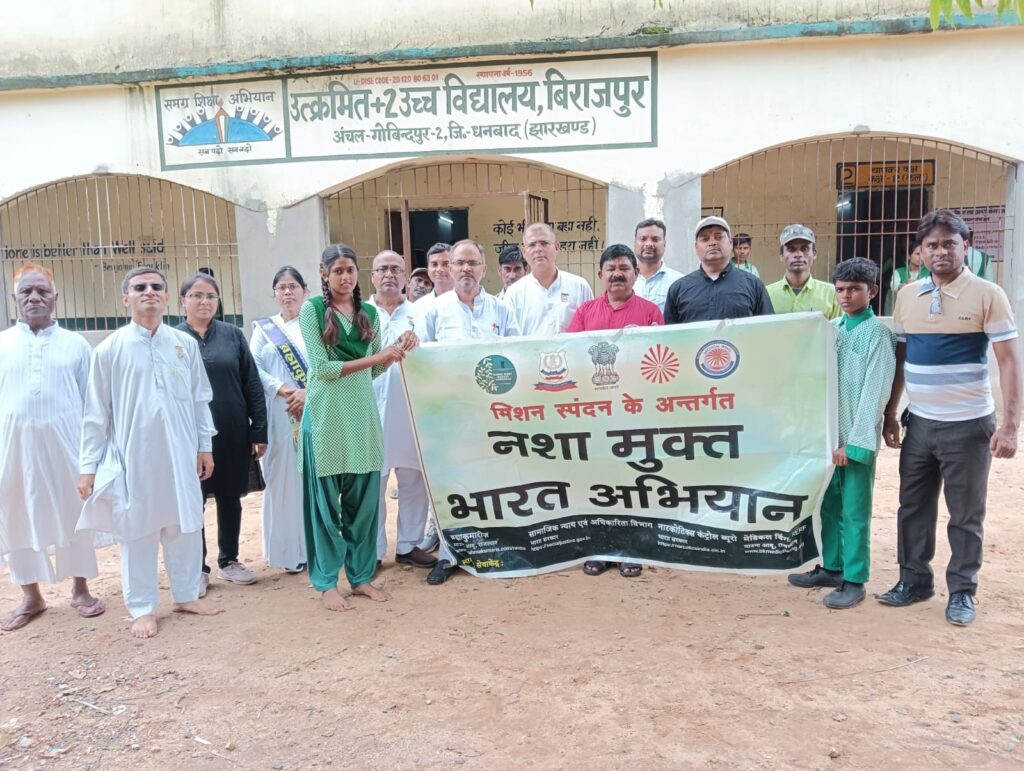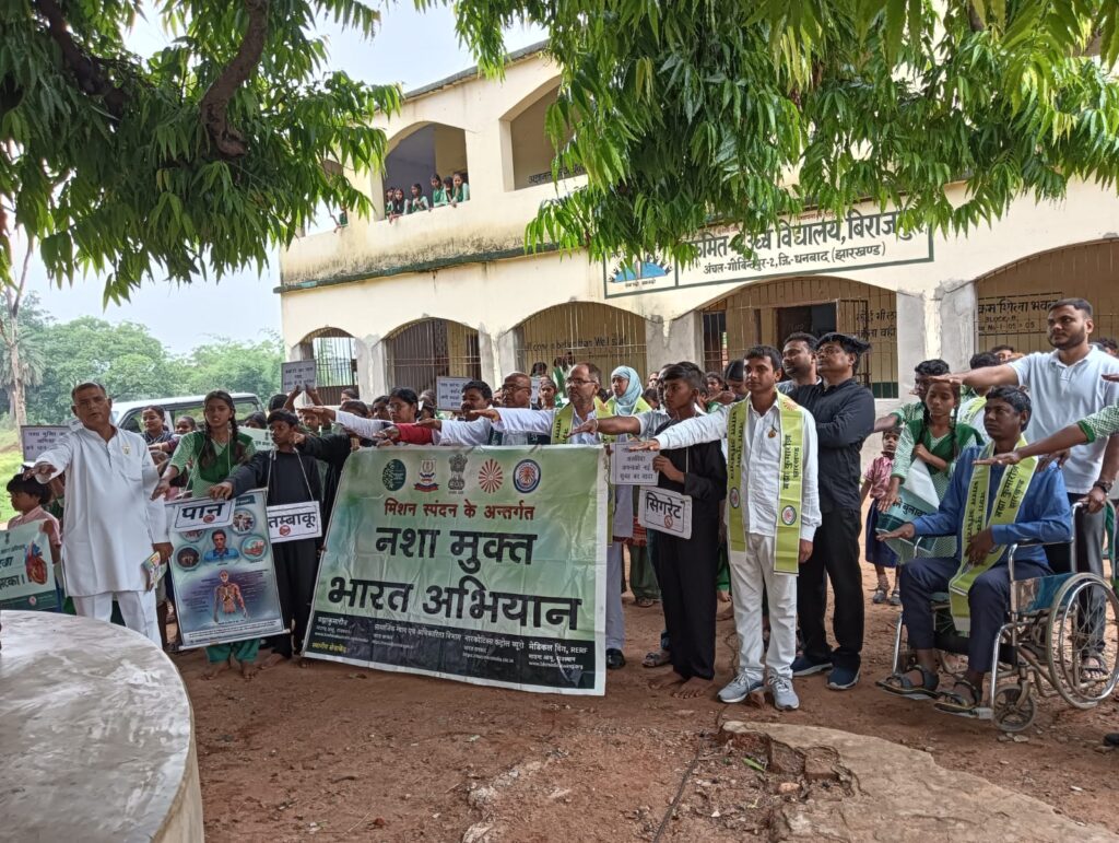 जिसमें संस्था से माधव झा रवि गुप्ता प्रीति गुप्ता उदय चौहान काकुली बहन पारस सिंह विधालय प्रबंधन से प्रभारी प्रधानाध्यापक अरूण कुमार अरुप चौधरी संतोष कुमार सिंह नीरज कु प्रसाद विपिन बिहारी गंगा कुमारी श्रवण कुमार संजय गोप धर्मेंद्र माहतो स्थानीय पुर्व मुखिया पुरण रविदास मुकुटधारी माहतो नेमलाल माहतो अन्य शिक्षक शिक्षिकाओं सहित अन्य विधार्थीगण ग्रामीण उपस्थित थे सभी ने नशा मुक्त भारत नशा मुक्त धनबाद नशा मुक्त राजगंज नशा मुक्त विराजपुर नशा मुक्त स्कूल नशा मुक्त समाज और घर परिवार का शपथ लिया वंदे मातरम भारत माता कि जय का नारा लगाया गया