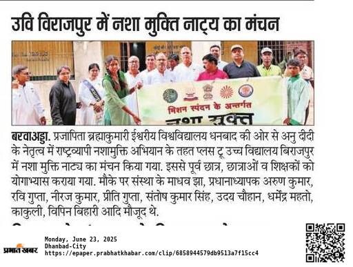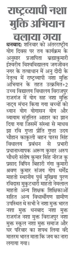 आज दिनांक 21/06/2025 को अंतरराष्ट्रीय योग दिवस पर तय कार्यक्रम के अनुसार प्रजापिता ब्रह्माकुमारी ईश्वरीय विश्वविद्यालय जगजीवन नगर के तत्वाधान में अनु दीदी के नेतृत्व में राष्ट्रव्यापी नशा मुक्ति अभियान के तहत उत्क्रमित+2 उच्च विद्यालय विराजपुर राजगंज में योग सह नशा मुक्ति नाट्य मंचन किया गया बच्चों को ध्यान योग योगासन योग और व्यायाम संतुलित आहार का झान दिया गया